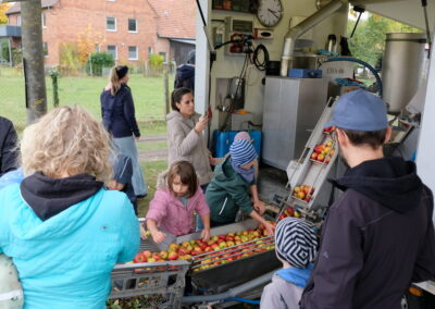 Die mobile Obstpresse der Saftjäger macht leckeren Saft aus mitgebrachtem Obst. Je nach Sorte und Reife werden aus 100 kg Äpfeln 60 bis 70 Liter Saft. Um Wartezeiten zu vermeiden ist eine Anmeldung unter saftjaeger.de erforderlich!